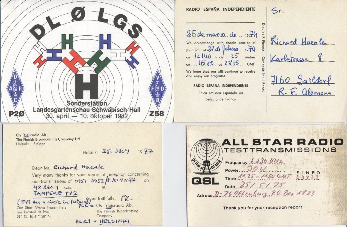 In den Siebziger- und Achtziger Jahren war ich also zunächst begeisterter BC-SWL, also nur Hörer von ausländischen Rundfunksendern, die vornehmlich auf den KW-Bändern ihre Auslandsprogramme ausstrahlten. Auch Clandestine-,TV-, Piraten-, Seefunk-, Zeitzeichen-, Normalfrequenz-, Hospitalkirchenschiff-, Seefunk-, Post- und Telekommunikationssender